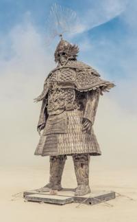 Lu Ming’s statue “Desert Guard” from Burning Man 2018 returns to J Resort’s Reno Neon Line. This statue draws inspiration from the armor worn by Genghis Khan, the leader of the Mongolian empire that dominated China in the 14th century. The statue’s armor is 32 feet tall and weighs 5.5 tons