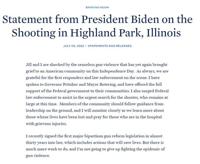 President Joe Biden on Monday said he and first lady Jill Biden were “shocked by the senseless gun violence that has yet again brought grief to an American community on this Independence Day.” He said he had “surged Federal law enforcement to assist in the urgent search for the shooter, who remains at large at this time.”