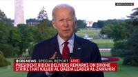 Speaking Monday evening from the White House, Biden says, “This terrorist leader is no more.”