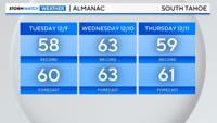 South Tahoe should be seeing snow in December instead of breaking records with highs in the 60’s. Like Reno, Tuesday, Wednesday, and Thursday will be the warmest days of the week. There won’t be much of a difference between Tahoe and Reno this week, with a ridge in place. The average high in Tahoe this time of year is 43 degrees.