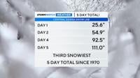 The Central Sierra Snow Lab keeps a daily record of the snow as long as it is possible to do so. They are recording 111 inches of snow over the past five days, which is the third snowiest five-day total ever reported at their station since 1970, when digital records began. 18.5 inches fell on Thursday alone. Their lab is located near Donner Summit.
