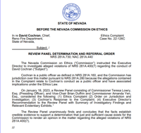 The Commission says Cochran's role in a political commercial for Senator Catherine Cortez Masto violated NRS 281A.400(7).