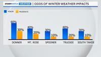 The odds of experiencing minor travel impacts in the Sierra are over 50% on Thursday, but the odds of having moderate impacts are less than 40%. More snow will fall on the western side of the Sierra, with much less snow falling along Mt. Rose Highway than Donner because of shadowing.