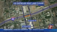 Monday night, March 21Â Â 8 p.m. to 5 a.m.: Right lane of eastbound I-80 closed between North Virginia Street and North Center Street.
