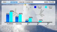 Flurries are likely Thursday morning even below 5000’ in the Truckee Meadows, with up to an inch possible in the foothills. Most of the valley will see nothing more than a dusting. A dusting can cause a lot of crashes if you’re not careful though.