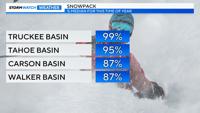 The storm in November really helped out our snowpack, as most of our basins are running close to median at this time. Reno usually sees its first measurable snow on November 22nd, one inch snowfall December 13th, and three inch snowfall January 10th. We've seen nearly a half inch of snowfall so far this season in Reno.Â