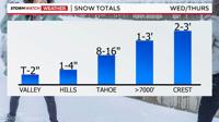 Valleys will see less than a couple inches of snow out of this storm, but Virginia City will see between 2-4 inches, mainly Wednesday night. Lake Tahoe, including Truckee and South Lake, will see between 8-16 inches.