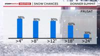 After a brief break in the snow at Donner Friday morning, more snow will start to fall at Donner by 11am Friday and persist through Saturday morning. A Winter storm Warning is up for the Tahoe basin beginning at 10am Friday and going through 10pm Saturday night. A couple more feet of heavy wet snow could fall in the high Sierra on the western side of Tahoe over the next 24 hours.