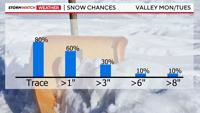 A third and final round of wintery weather moves in late Sunday through Tuesday. This will be the coldest round out of all of them, allowing the snow to pile up quickly. This means the Sierra could see another couple feet of snow above 7000’ in elevation. It will be more scattered in the valley on Monday and Tuesday, with a mix of both rain and snow. Snow totals will be light in the valley, with nothing more than a couple inches.