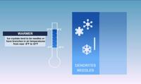 Temperatures colder than eight below Fahrenheit leads to crystals that resembles plates or columns. Warmer crystals ranging from -8° to 32° Fahrenheit leads to crystals that resembles needles or dendrites, with arms sticking out of the center... kind of like a flower.