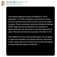 “This is difficult for me to write, but here it goes: I am not going to make that competitive commitment anymore,” Brady wrote in a lengthy post on Instagram. “I have loved my NFL career, and now it is time to focus my time and energy on other things that require my attention.”