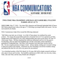 Bill Walton, who starred for John Wooden's UCLA Bruins before becoming a Hall of Famer and one of the biggest stars in basketball broadcasting, died Monday, the league announced on behalf of his family.