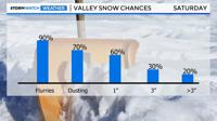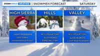 Reno could see up to a couple of inches, with less than a 30% chance of more than that. High temperatures will struggle to get above the mid-30s on Saturday, so it will stay slick for much of the day, possibly into Sunday morning. Carson City will see more snow than Reno.