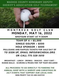 The Washoe County Honorary Deputy Sheriff’s Association (WCHDSA) will be hosting its 2nd Annual Charity Golf Tournament at Montreux Golf and Country Club on Monday, May 16, 2022.Â