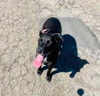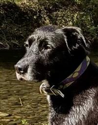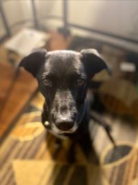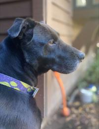 The dog is a 10-year-old black lab mix named Lola with a white patch on her chest and a blue and green collar.
