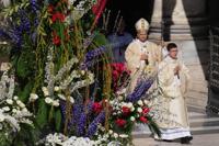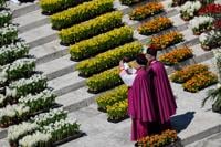 Earlier, Leo addressed some 50,000 faithful from an open-air altar in St. Peter’s Square flanked with white roses, while the steps leading down to the piazza where the faithful gathered were filled with spring perennials, symbolically resonating with the pope’s words.
