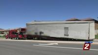 Reno Police say Rio Wrangler and Veterans Parkway remains closed after a module classroom tipped over onto the roadway Thursday morning.