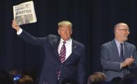 President Trump triumphantly held up copies of two newspapers with banner "ACQUITTED!" headlines as he took the stage at the National Prayer Breakfast in Washington.