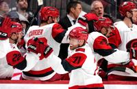 Carolina Hurricanes' Taylor Hall (71) celebrates at the benc after scoring a goal against the Ottawa Senators during the second period in Game 4 of a first-round NHL Stanley Cup playoff hockey series, Saturday, April 25, 2026, in Ottawa, Ontario. (Justin Tang/The Canadian Press via AP)