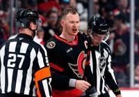 Ottawa Senators winger Brady Tkachuk's lip bleeds as he is escorted by officials after fighting with Carolina Hurricanes' K'andre Miller during the second period in Game 4 of a first-round NHL Stanley Cup playoff hockey series, Saturday, April 25, 2026, in Ottawa, Ontario. (Justin Tang/The Canadian Press via AP)