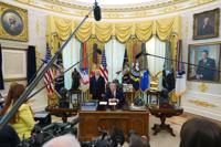 President Donald Trump answers questions from reporters after signing an executive order in the Oval Office of the White House Tuesday, March 31, 2026, in Washington, as Commerce Secretary Howard Lutnick listens. (AP Photo/Alex Brandon)