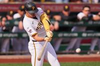 Pittsburgh Pirates' Konnor Griffin hits an RBI double, his first Major League career hit and run, during the second inning of a baseball game against the Baltimore Orioles in Pittsburgh, Friday, April 3, 2026. (AP Photo/Gene J. Puskar)