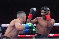 Shadur Stevenson, left, fights Teofimo Lopez during a super lightweight title boxing match Sunday, Feb. 1, 2026, in New York. (AP Photo/Frank Franklin II)