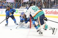 New York Sirens' Kristyna Kaltounkova, front, brings the puck around the net to shoot at Toronto Sceptres goaltender Elaine Chuli, second left, during the first period of an PWHL hockey game in Toronto, Tuesday, Jan. 6, 2026. (Chris Young/The Canadian Press via AP)