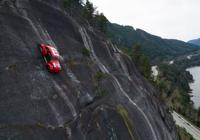 The shell of a Volkswagen Beetle hangs suspended on a cliff above the Sea-to-Sky Highway, in Squamish, British Columbia, Monday, April 6, 2026, after it appeared on the rock face last week with a large "E" on its roof, indicating that University of British Columbia engineering students carried out a long-standing tradition of placing the shell in difficult to reach locations. (Darryl Dyck/The Canadian Press via AP)