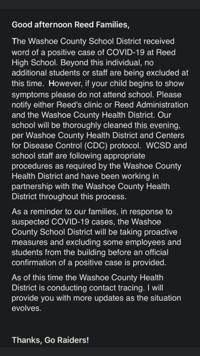 The Washoe County School District (WCSD) has received word of a confirmed positive case of COVID-19 at Reed High School.