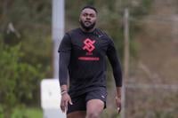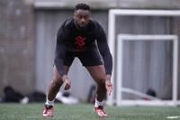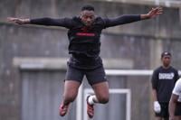 Oluwanifemi 'Neff' Giwa takes part in a football workout session at the National Sports Center, Crystal Palace in London, Sunday, March 29, 2026. (AP Photo/Alastair Grant)