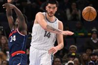 FILE - Memphis Grizzlies center Zach Edey (14) passes away from Los Angeles Clippers forward Kobe Brown (24) during an NBA basketball game Friday, Dec. 5, 2025, in Memphis, Tenn. (AP Photo/John Amis, file)