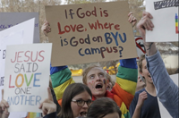 Several hundred Brigham Young University students protested Friday afternoon outside church headquarters in Salt Lake City to show their displeasure with a letter this week that clarified that 'same-sex romantic behavior' is not allowed on campus.