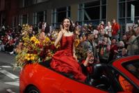 Olympic gold medalist and Grand Marhsal Eileen Gu, bottom middle, waves during the Chinese New Year Parade in San Francisco, Saturday, March 7, 2026. (AP Photo/Jeff Chiu)