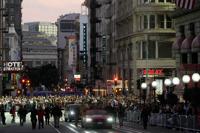Olympic gold medalist and Grand Marhsal Eileen Gu, middle left, gestures during the Chinese New Year Parade in San Francisco, Saturday, March 7, 2026. (AP Photo/Jeff Chiu)