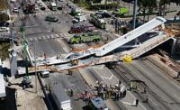 Authorities say that the cables suspending a pedestrian bridge were being tightened after a “stress test” when the 950-ton concrete span collapsed over traffic, killing at least six people only days after its installation was celebrated as a technological innovation.