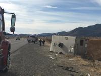 NHP says two people were taken to the hospital after a motorhome trailering an SUV rolled over on I-80 eastbound near Derby Dam on Wednesday.