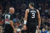 Phoenix Suns forward Dillon Brooks (3) argues with referee Jacyn Goble (68) before getting a technical foul called on him during the first half of Game 4 in a first-round NBA playoffs basketball series against the Oklahoma City Thunder, Monday, April 27, 2026, in Phoenix. (AP Photo/Ross D. Franklin)