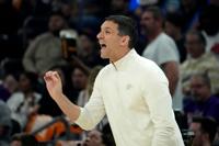 Oklahoma City Thunder head coach Mark Daigneault shouts instructions to his players during the first half of Game 4 in a first-round NBA playoffs basketball series against the Phoenix Suns, Monday, April 27, 2026, in Phoenix. (AP Photo/Ross D. Franklin)