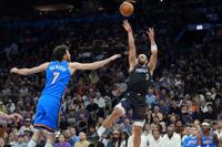 Oklahoma City Thunder guard Alex Caruso celebrates his 3-pointer against the Phoenix Suns during the first half of Game 4 in a first-round NBA playoffs basketball series, Monday, April 27, 2026, in Phoenix. (AP Photo/Ross D. Franklin)