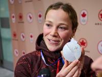 Canadian ice hockey player Sarah Fillier shows her 2026 Olympic silver medal as she speaks with media at Pearson Airport in Toronto, Monday, Feb. 23, 2026. (Sammy Kogan/The Canadian Press via AP)