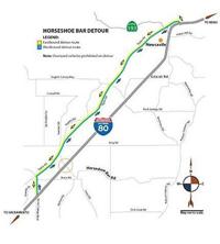 Caltrans says Interstate 80 will be closed overnight in both directions in south Placer County as crews raise the Horseshoe Bar Road Overcrossing. Motorists can expect an eight-mile detour during the closure scheduled to start at 11 p.m. Tuesday and end at approximately 5 a.m. Wednesday.