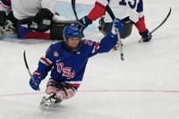 United States's Jack Wallace celebrates after scoring his side's first goal during a gold medal ice hockey match between United States and Canada at the 2026 Winter Paralympics, in Milan, Italy, Sunday, March 15, 2026. (AP Photo/Luca Bruno)