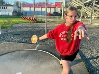 Becky Pepper-Jackson prepares to throw a discus Tuesday, April 7, 2026, at Bridgeport High School in Bridgeport, W.VA. (AP Photo/John Raby)