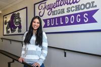 Fayetteville High senior Lily Adler, president of the Young Democrats of Arkansas, is photographed in the halls at Fayetteville High School Tuesday, April, 7, 2026 in Fayetteville, Ark. (AP Photo/Michael Woods) CORRECTION: Adler, not Alder