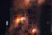Bosnia supporters light flares as they watch from an apartment building just outside the stadium during the World Cup qualifying playoff final soccer match between Bosnia and Italy in Zenica, Bosnia, Tuesday, March 31, 2026. (Fabio Ferrari/LaPresse via AP)