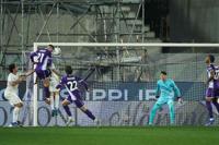 Fiorentina's Robin Everardus Gosens heads the ball to score their side's first goal of the game during the Serie A soccer match between Fiorentina and Lazio in Florence, Italy, Monday, April 13, 2026. (Massimo Paolone/LaPresse via AP)