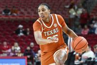 FILE - Texas forward Madison Booker (35) runs a play against Arkansas during an NCAA college basketball game Thursday, Feb. 19, 2026, in Fayetteville, Ark. (AP Photo/Michael Woods, File)