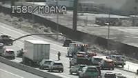 Traffic is slowing on I-580 southbound near East Moana Lane as emergency crews respond to an incident on Monday.