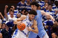 Duke's Dame Sarr (7) dunks ahead of North Carolina's Derek Dixon (3) during the second half of an NCAA college basketball game in Durham, N.C., Saturday, March 7, 2026. (AP Photo/Ben McKeown)